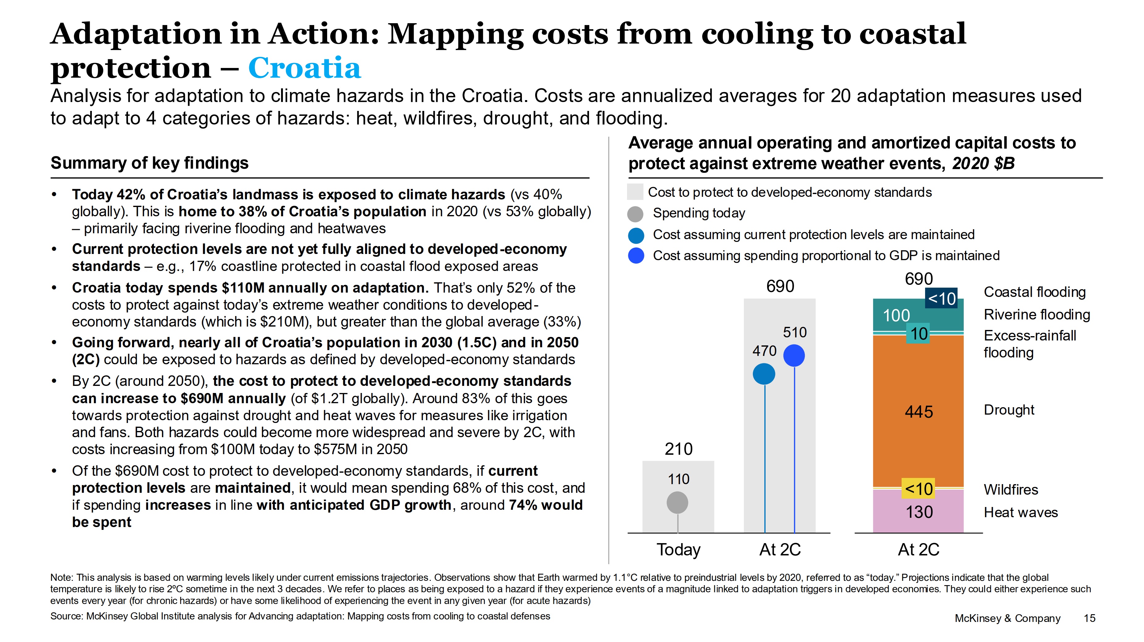 Istraživanje upozorava kako je danas 42% kopnenog područja Hrvatske izloženo klimatskim opasnostima, a prema podacima iz 2020. godine, to je dom za 38% stanovništva koje je uglavnom suočeno s rizicima od poplava rijeka i toplinskim valovima. Napominje se kako Hrvatska danas troši 110 milijuna dolara godišnje na prilagodbu što je samo 52% troškova potrebnih da se zaštiti od današnjih ekstremnih vremenskih uvjeta prema standardima razvijenih ekonomija (što iznosi 210 milijuna dolara), a to pokazuju i trenutne razine zaštite koji još nisu u potpunosti usklađene sa standardima – primjerice, samo 17% obale zaštićeno je na područjima izloženima obalnim poplavama.