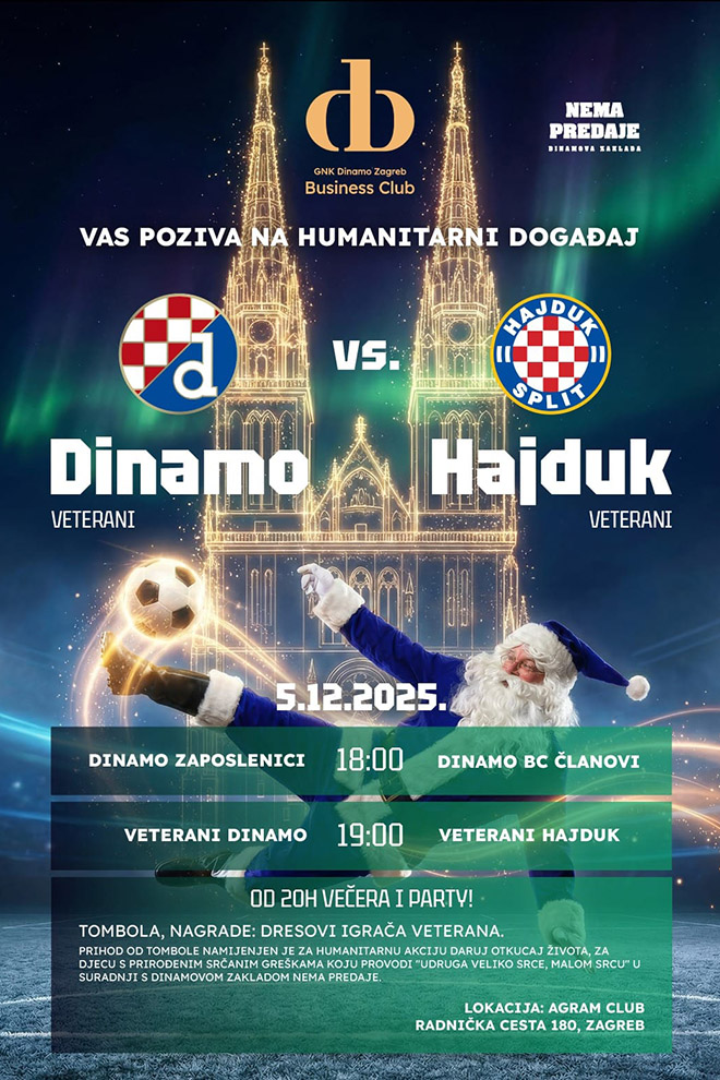 Dan uoči derbija Dinama i Hajduka u Maksimiru, u Zagrebu će snage odmjeriti veterani ova dva kluba. Utakmica se igra u humanitarne svrhe, a 'bijeli' stižu u jakoj postavi, gdje su najavljeni: