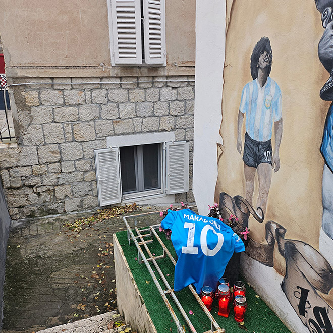 Maradonin mural je u Radunici, ispod onoga legendarne bijele desetke Jurice Jerkovića, a danas je peta godišnjica smrti legendarnog Argentinca, nogometnog čarobnjaka, koji je svojim nastupima ostavio trajan pečat u srcima brojnih generacija ljubitelja ove igre širom planete.