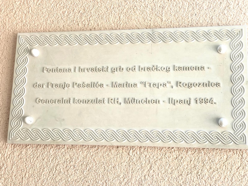 Ploča je postavljena u vrtu konzulata, uz kamenu fontanu u čijem se središtu nalazi grb koji je Pašalić dao isklesati na Braču i prevesti u Njemačku. Tijekom svečanosti Pašalić se prisjetio devedesetih godina, kada je realizirana kupnja zgrade konzulata u Münchenu.