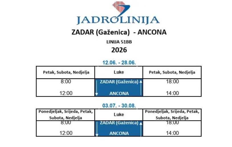 Jadrolinija je objavila međunarodni red plovidbe koja u slučaju najkraće prekomorske veze između Zadar i Ancona postaje dvostruka. Uz trajektnu bit će i to i katamaranska linija koju će održavati katamaran Jelena. U visokoj sezoni planirano je do pet tjednih veza, a putovanje traje samo četiri sata, što omogućuje brz dolazak na odredište i veću fleksibilnost, navodi se u objavi Jadrolinije u kojoj se nitko ne sjeća da je vožnja hidrogliserom nekadašnje agencije Turisthotela, a poslije Mia Toursa, trajala tri sata po dobrim uvjetima na moru.