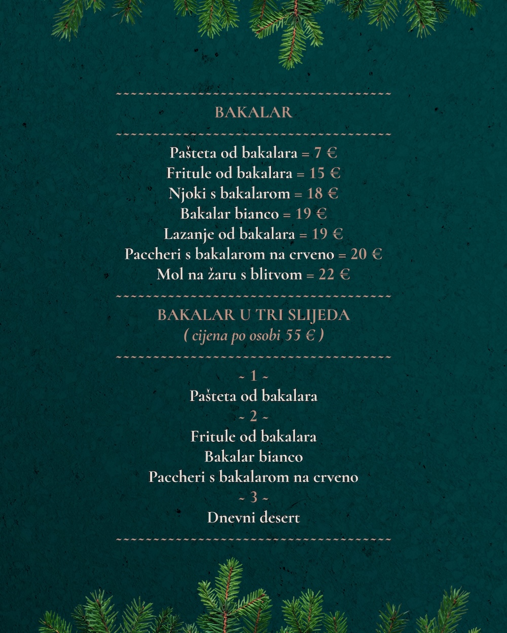 Za one koji žele potpuno gastronomsko iskustvo, tu je i gurmanski meni u tri slijeda, po cijeni od 55 eura po osobi. Uključuje paštetu od bakalara, fritule od bakalara, bakalar na bianco, pacchere s bakalarom na crveno te dnevni desert – savršeno osmišljeno putovanje kroz blagdanske okuse.