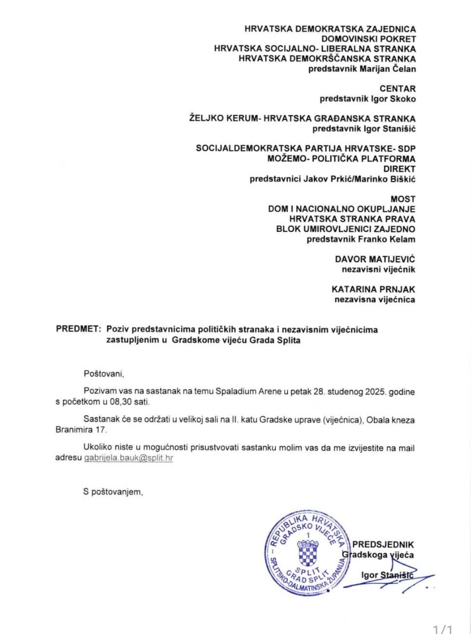 Grad Split je na korak od vraćanja Spaladium Arene pod svoje skute. Gradonačelnik Tomislav Šuta održat će sastanak s predstavnicima svih opcija u Gradskom vijeću, na kojem će im prezentirati dogovor. Poziv u je poslao predsjednik Gradskog vijeća Igor Stanišić, a