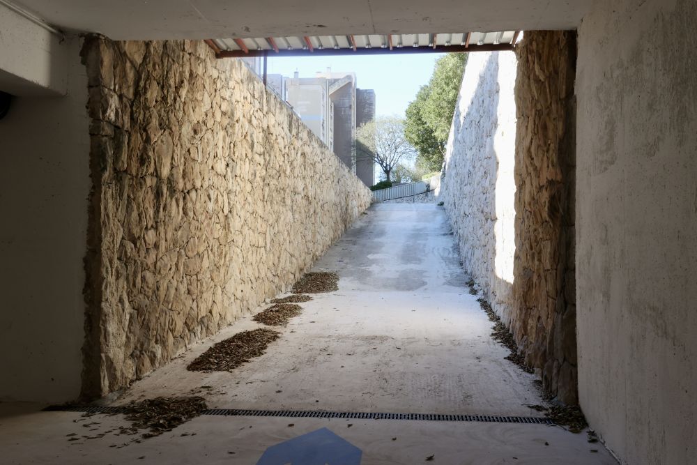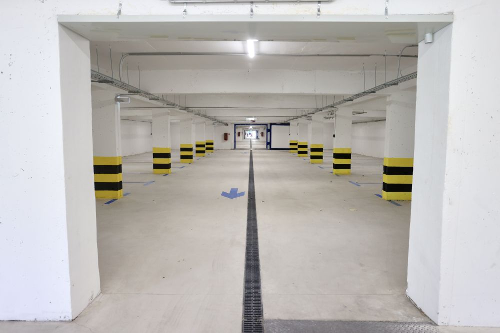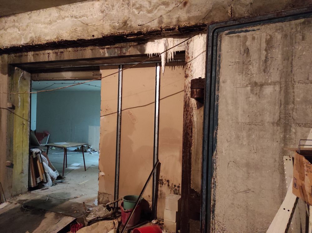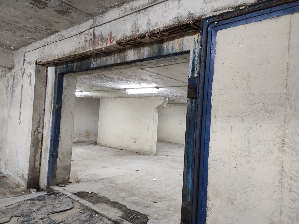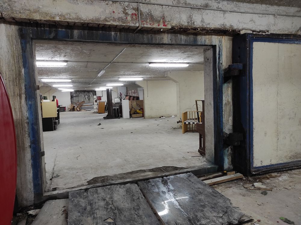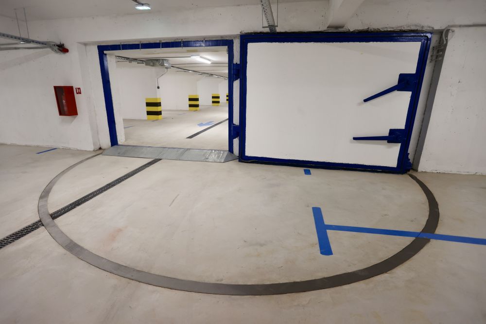 Nekadašnje sklonište sada je primarno garaža, ali su se zadržala teška metalna vrata koja omogućuju pregradnju prostora u tri dijela.