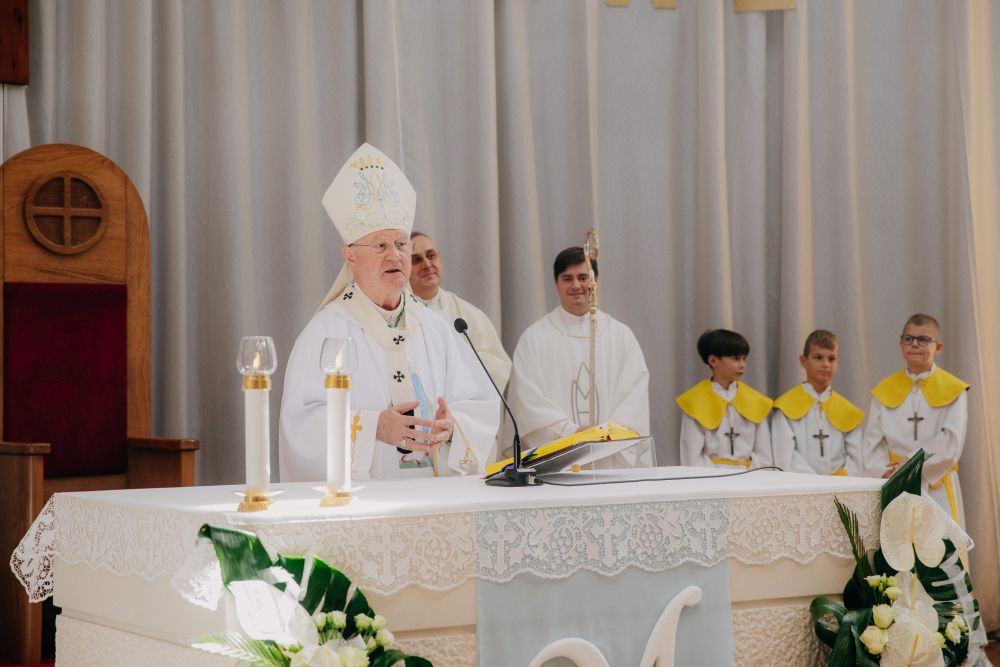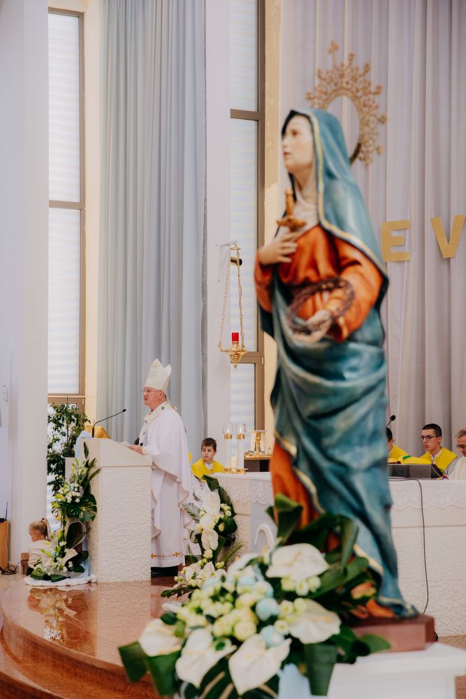 Nadbiskup je u propovijedi istaknuo kako župa slavi svoj patron - Materinstvo Blažene Djevice Marije, naglašavajući da ovo otajstvo nije tek spomen biološkog, nego duboko duhovnog i milosnog majčinstva koje je proizišlo iz Marijina potpunog povjerenja Bogu. Podsjetio je vjernike da se Marijino majčinstvo ne zaustavlja u trenutku Isusova rođenja, nego se nastavlja pod križem kada joj Krist povjerava čitavu Crkvu. Govoreći o njezinoj trajnoj prisutnosti u životu vjernika, naznačio je kako mnogi u molitvi osjećaju snagu njezine blizine te istaknuo kako Marija ne ostavlja svoju djecu, pozivajući sve da joj se s povjerenjem utječu. Nadbiskup je istaknuo da Crkva Mariju naziva Majkom Milosti jer je po njoj milost ušla u svijet te je vjernike pozvao da poput nje budu nositelji milosti u vremenu obilježenom nemirom, ravnodušnošću i duhovnom prazninom. Istaknuo je kako i danas Bog traži vjernike koji će poput Marije odgovoriti poslušnošću i predanjem. U tom je kontekstu upozorio da vjera bez zahvalnosti lako sklizne u površnost.