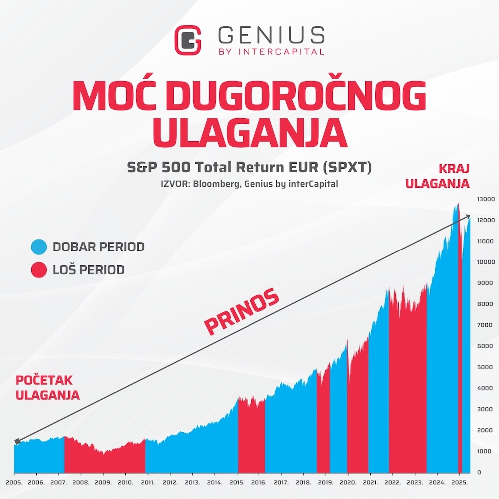Vrijeme je vaš najveći saveznik jer omogućuje da vaše ulaganje preživi one kratkoročne loše periode i iskoriste dugoročni rast. Ako svaki mjesec ulažete pomalo, koliko je vama prihvatljivo, i ostanete dosljedni, tržište radi za vas – a ne obratno.