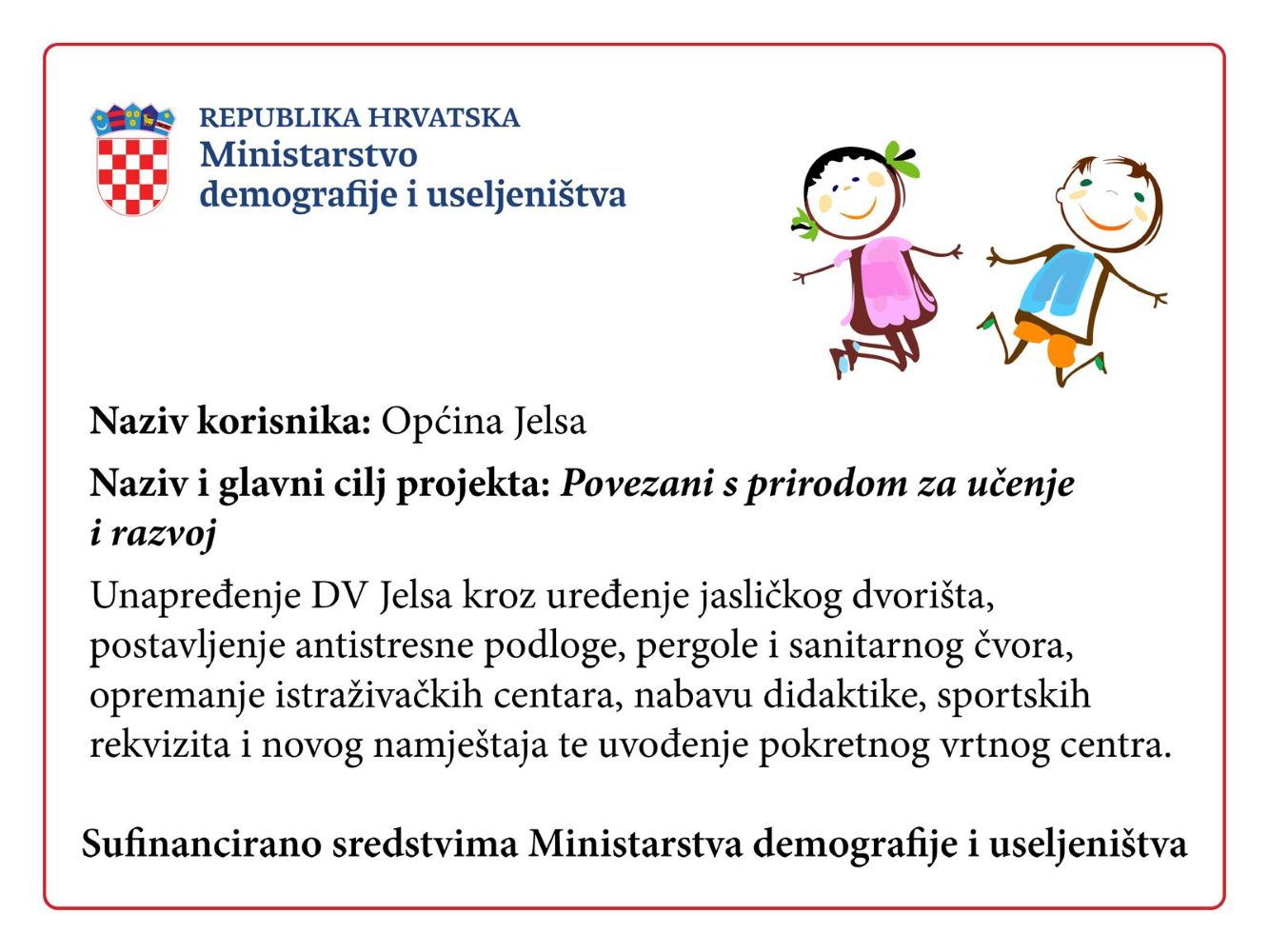 Provedbom ovog projekta Općina Jelsa nastavlja ulagati u najmlađe članove zajednice, osiguravajući im sigurno, moderno i poticajno okruženje za učenje, igru i razvoj. Time se dodatno unapređuje kvaliteta ranog i predškolskog odgoja te jača briga o obiteljima i djeci u lokalnoj zajednici', naveli su iz DV-a.