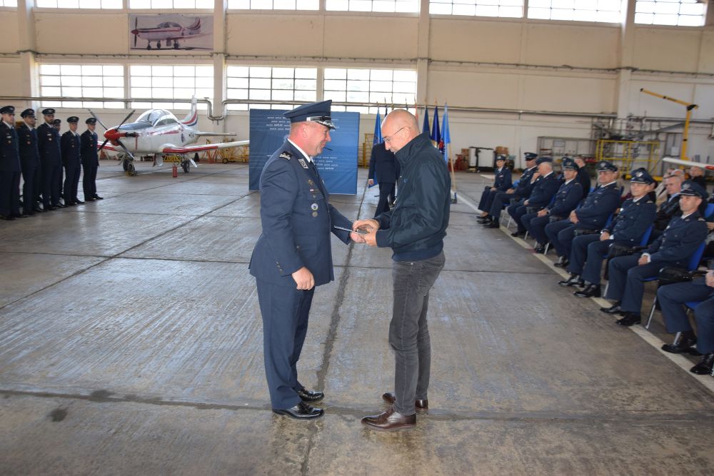 U vojarni 'Pukovnik Marko Živković' 93. krila Hrvatskog ratnog zrakoplovstva u Zemuniku u petak, 3. listopada 2025., svečano su dodijeljeni letački znakovi novim vojnim pilotima, počasni letački znak bivšem ministru obrane umirovljenom general-bojniku Damiru Krstičeviću i zlatni letački znak brigadnom generalu Davoru Tretinjaku, pukovniku Robertu Paradžiku i pukovniku Nediljku Puljeviću.