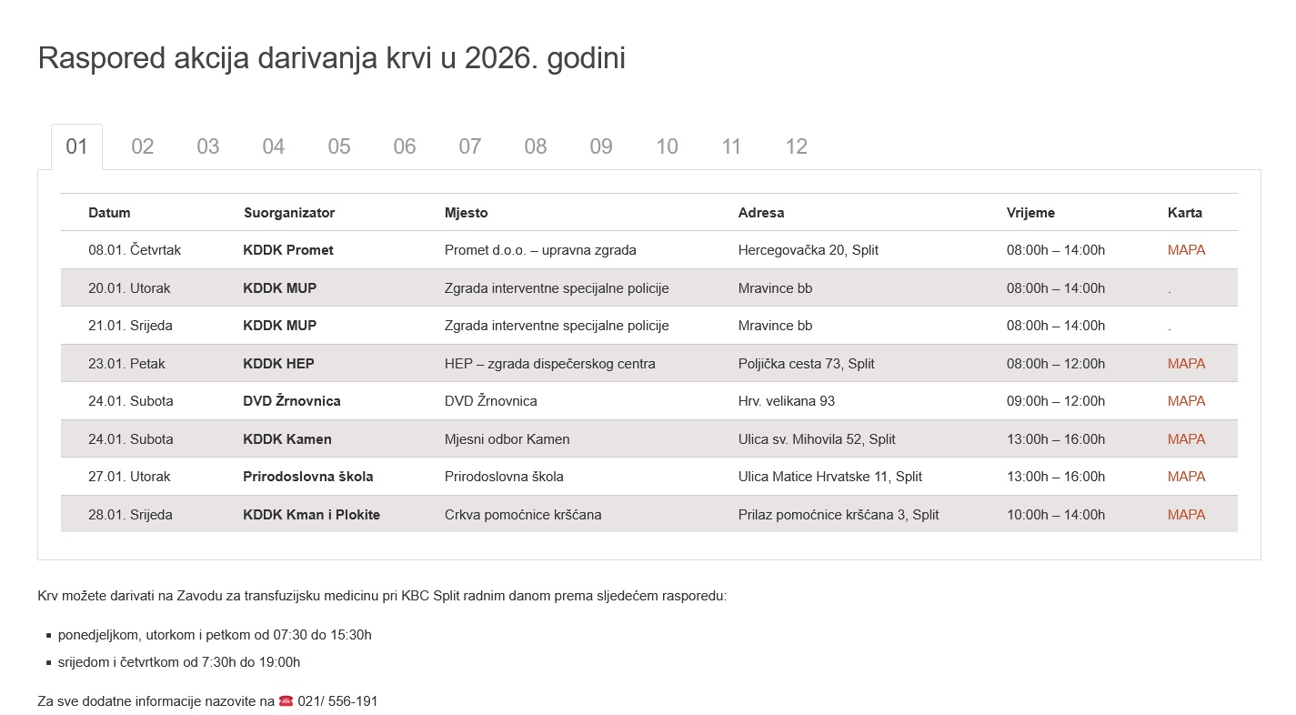 Krv se može darivati svakodnevno na organiziranim akcijama darivanja u Splitsko-dalmatinskoj i Šibensko-kninskoj županiji. Raspored akcija nalazi se na strani Crvenog križa.