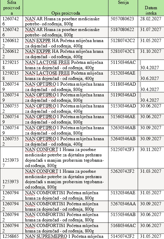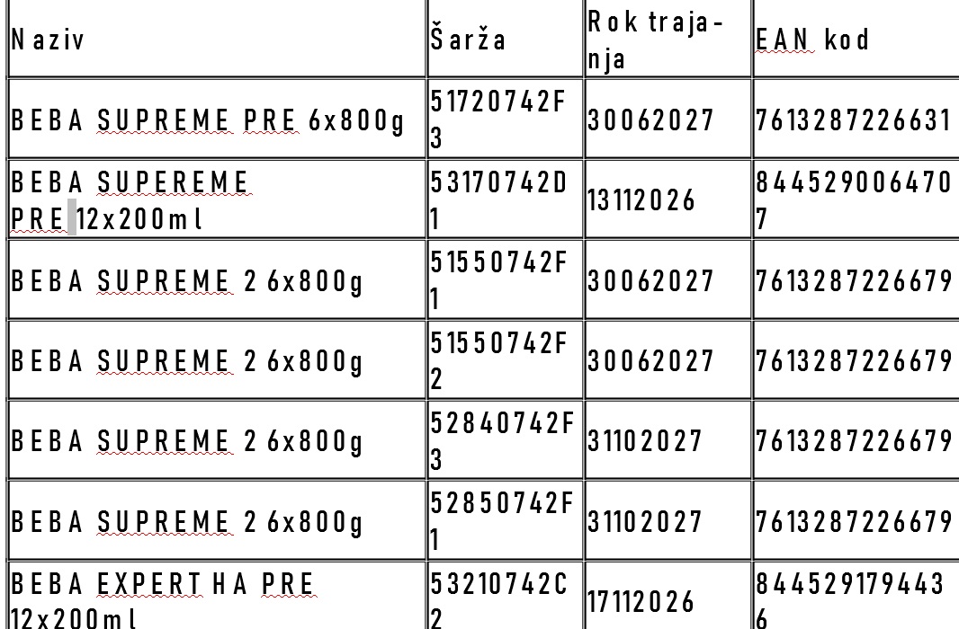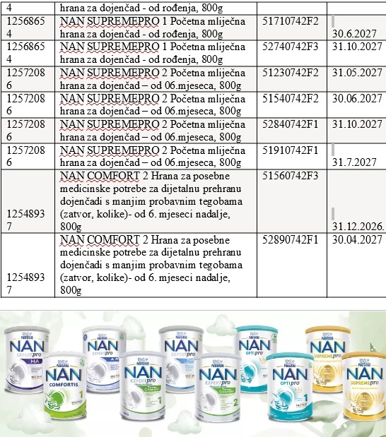 Državni inspektorat Republike Hrvatske obavještava potrošače o opozivu ograničenih serija određenih NAN formula za dojenčad te hrana za bebe: BEBA pre, BEBA expert, BEBA comfort, BEBA supreme.