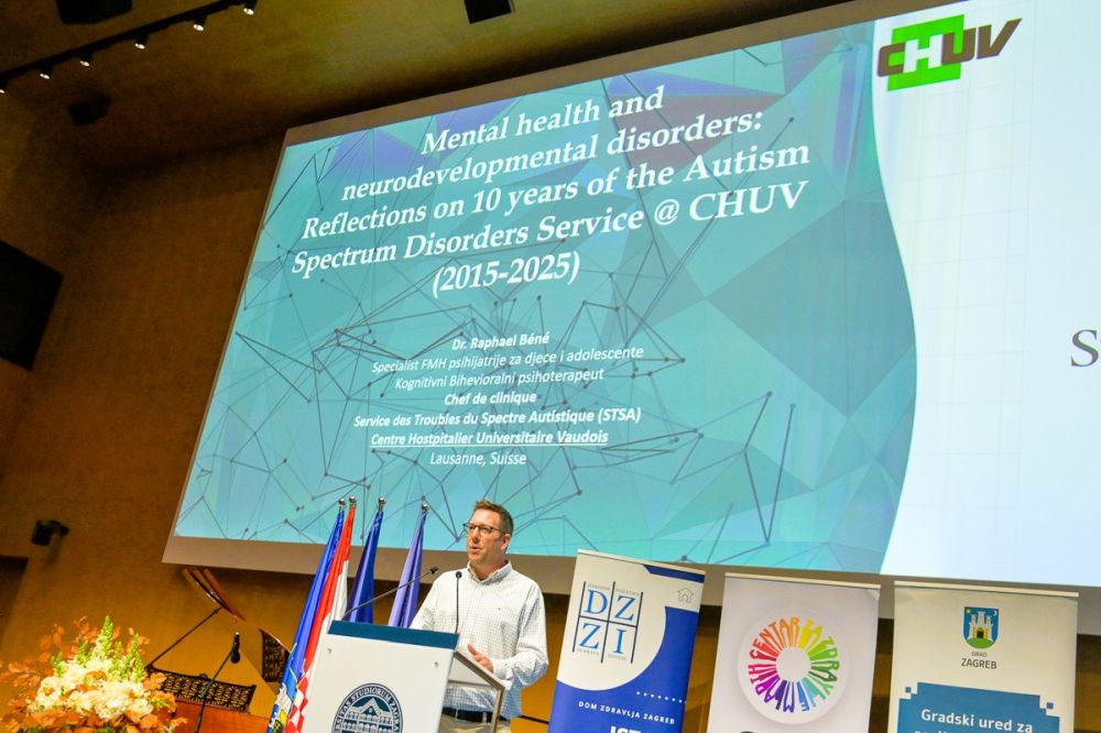 Plenarno izlaganje održao dr. RaphaëlBéné, specijalist dječje i adolescentne psihijatrije i kognitivno-bihevioralni psihoterapeut s Klinike za neurorazvojne poremećaje Sveučilišne bolnice CHUV u Lausannei, Švicarska, koji je sudionike proveo kroz desetljeće iskustva rada s osobama iz spektra autizma, povezujući kliničku praksu s temom Simpozija – Um na rubu budućnosti. Poseban naglasak stavio je na doprinos autističnih i neurodivergentnih osoba, čije jedinstvene kognitivne perspektive oblikuju razvoj digitalnih tehnologija i umjetne inteligencije. Kroz otpornost, kreativnost i društveni utjecaj, neurodiverzitet zaista oblikuje budućnost – stoga su sudionici imali privilegiju čuti tu priču iz prve ruke.