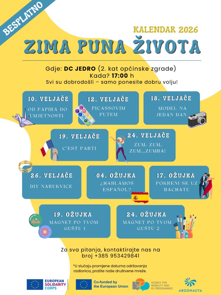 Najavili su tako novo izdanje zimskog programa radionica 'Zima puna života'. Program počinje u utorak, 10. veljače 2026., u 17 sati. Odvijat će se u Društvenom centru Jedro.