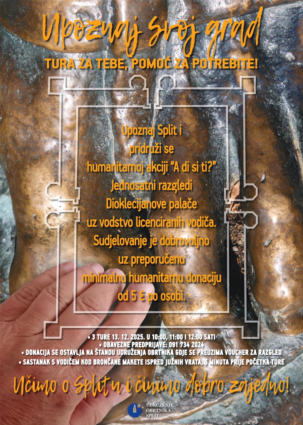 Na dan akcije, donacija se ostavlja na štandu Udruženja obrtnika Split, gdje se preuzima i voucher za razgled. Sastanak s vodičem je kod brončane makete ispred Južnih vrata, pet minuta prije početka odabrane ture.