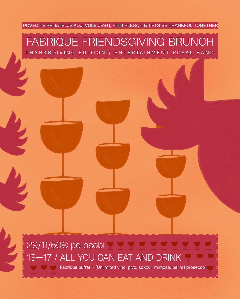 Pozivamo vas svih na naš posebni Friendsgiving Brunch – slavlje prijatelja, hrane i dobre zabave za sve koje vole daily drinking i spavanje na vrijeme, kao i za one koji traže savršenu izliku za piti mimose cijeli dan!