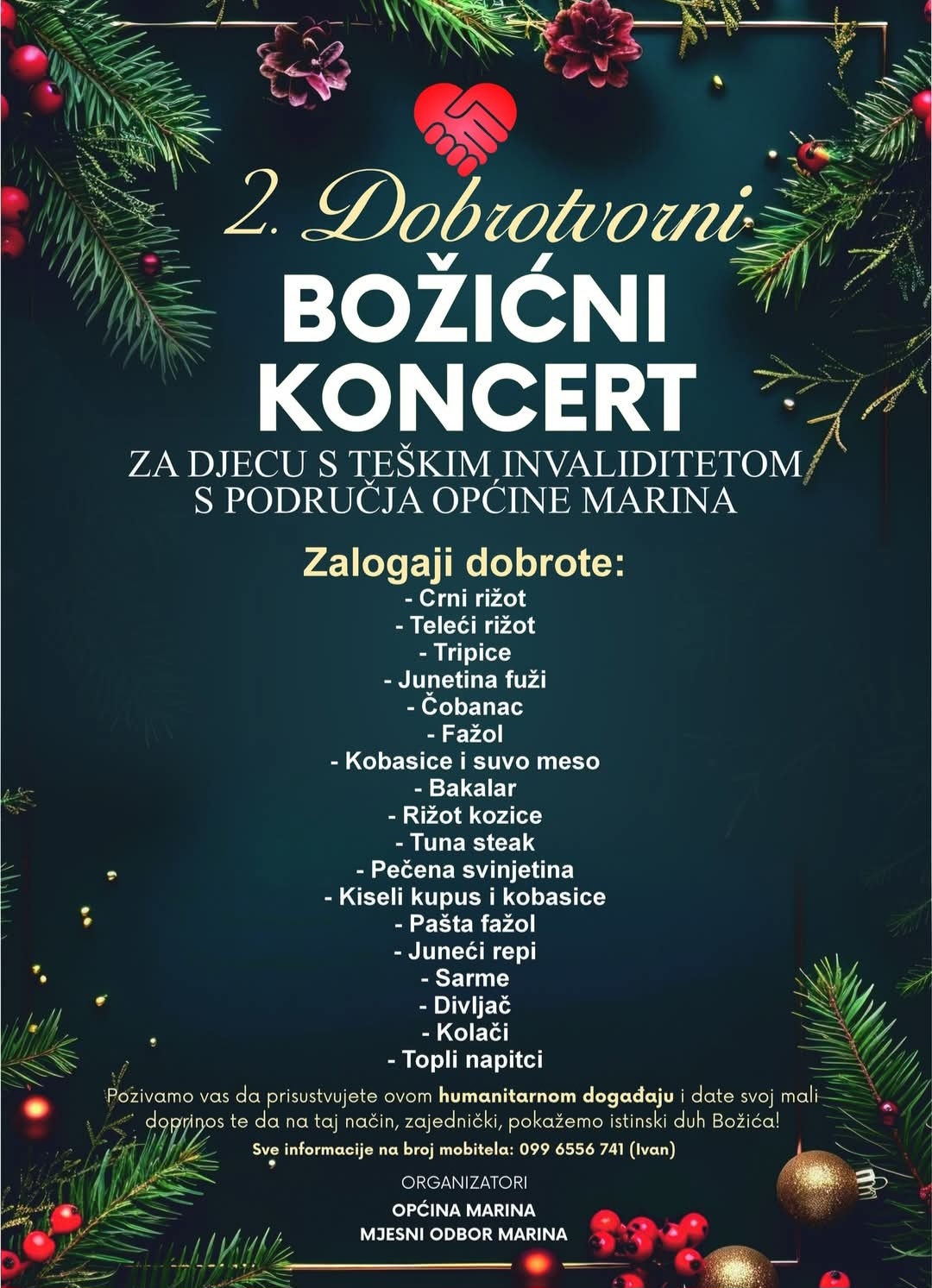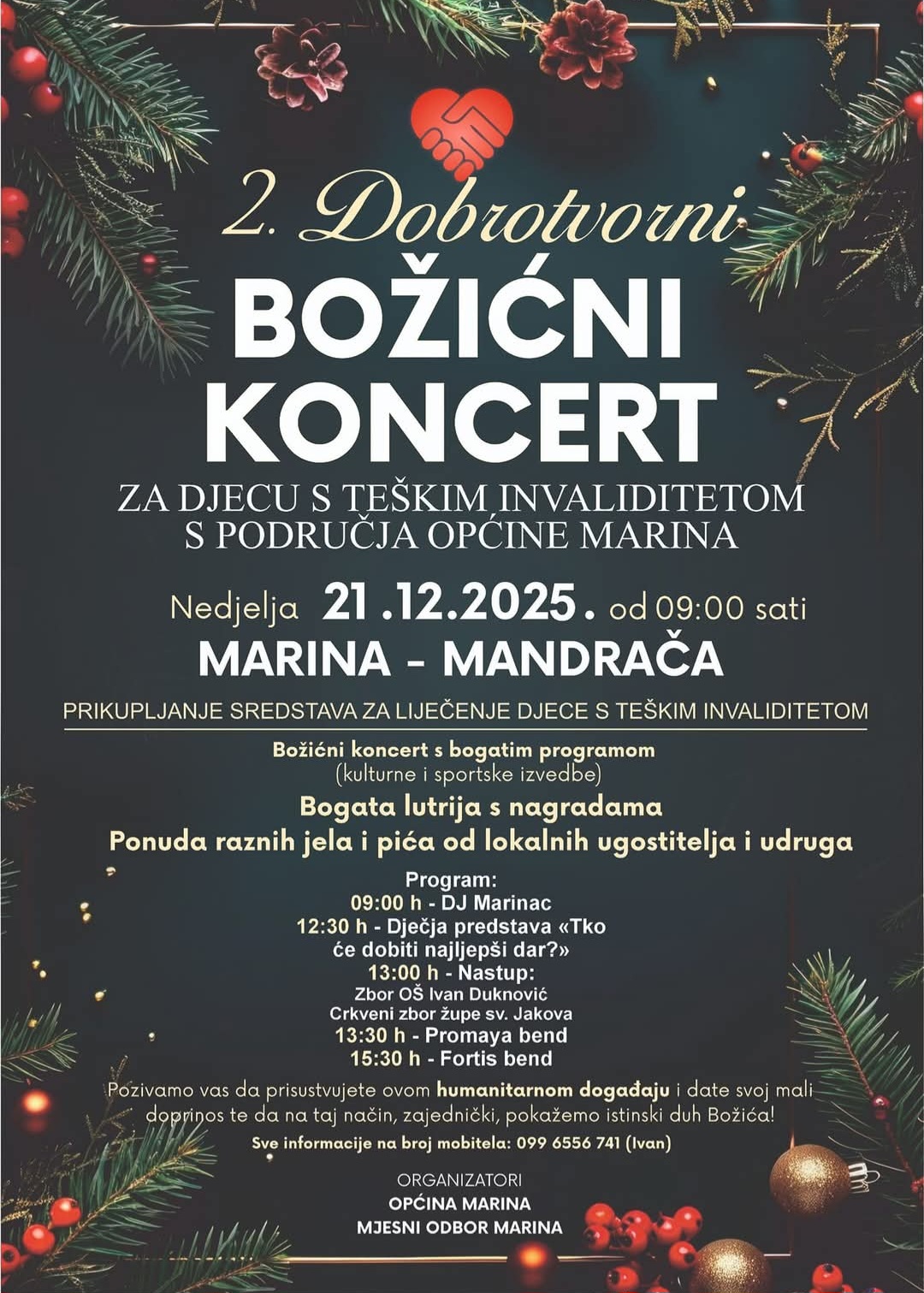 U nedjelju, 21. prosinca od 9 sati na marinskom mandraču održat će se humanitarni, božićni koncert kojim se prikupljaju sredstava za liječenje djece s teškim invaliditetom s područja Općine Marina.