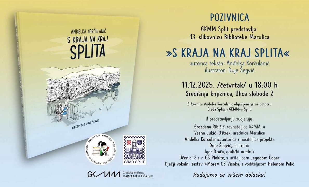 U četvrtak, 11. prosinca, u 18 sati u središnjem odjelu Gradske knjižnice Marka Marulića u Splitu, održat će se promocija slikovnice 'S kraja na kraj Splita', autorice Anđelke Korčulanić.