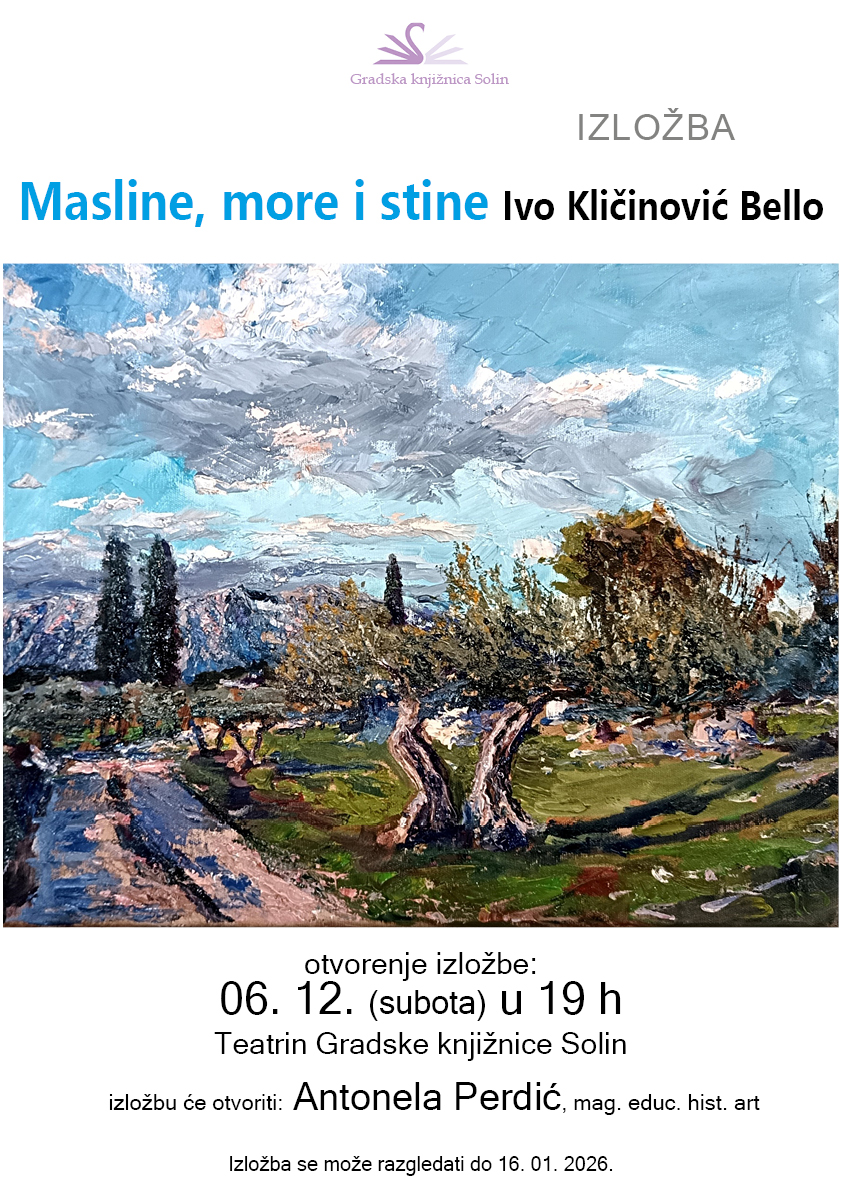 Gradska knjižnica Solin poziva na otvaranje izložbe 'Masline, more i stine' akademskog slikara Ive Kličinovića Bella koje će se održati u subotu, 6. prosinca u 19 sati, u Teatrinu GK Solin.