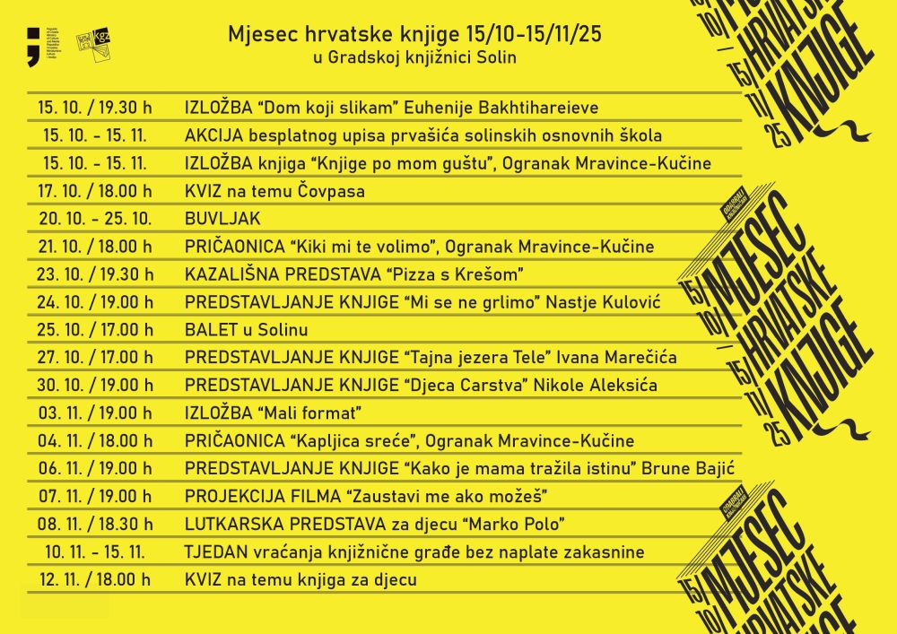 Gradska knjižnica Solin i ove je godine za svoje korisnike i posjetitelje pripremila niz zanimljivih aktivnosti za djecu i odrasle u sklopu Mjeseca hrvatske knjige, koji se ove godine održava pod sloganom 'Odabrali knjižničari'. Uz bogat program, pripremljeno je i nekoliko pogodnosti za sve ljubitelje knjige.