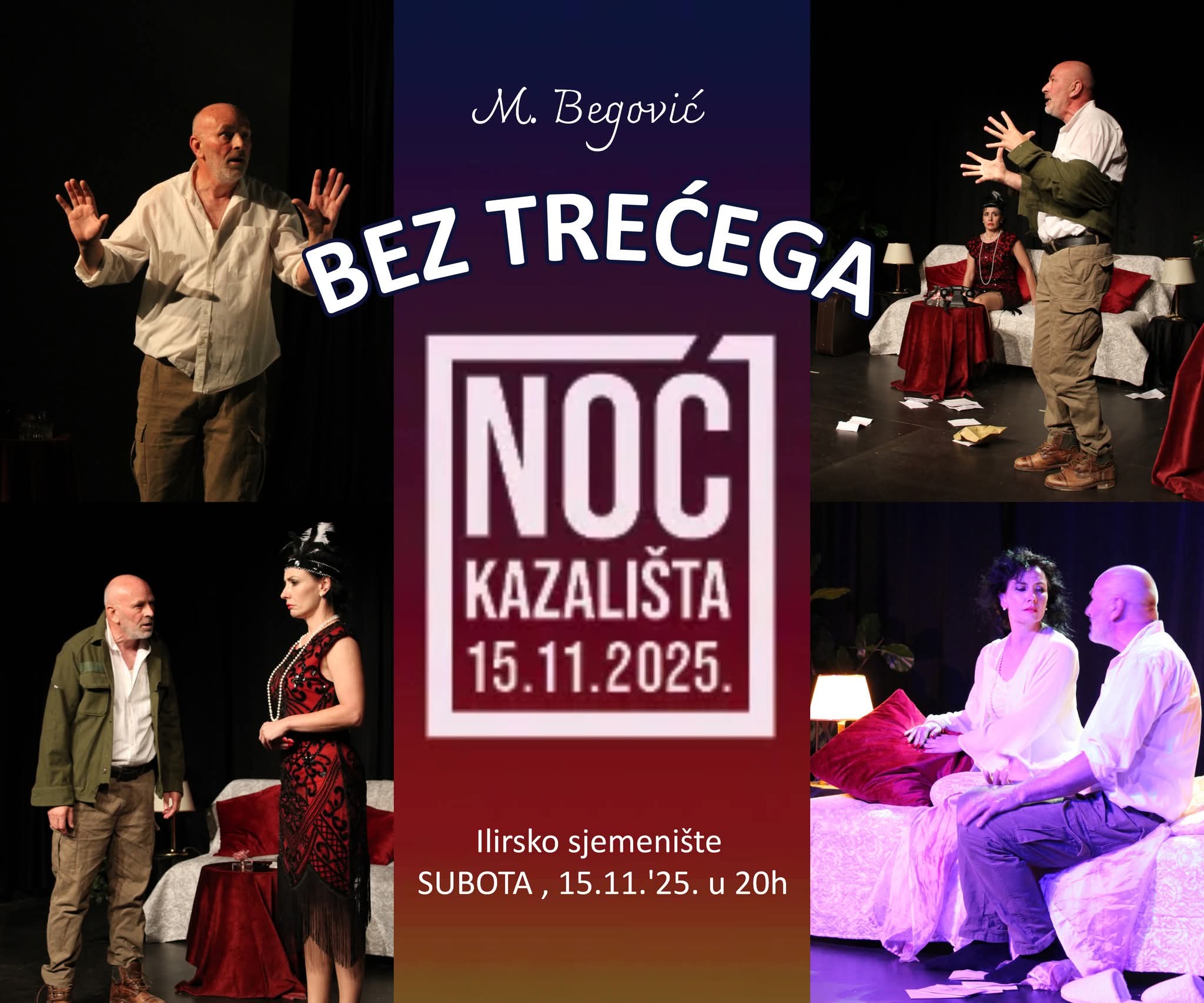 U sklopu ovogodišnje Noći kazališta, koja se održava diljem Hrvatske, građani Omiša i cijele Dalmacije imat će priliku pogledati jednu od najintenzivnijih psiholoških drama hrvatske književnosti – 'Bez trećega', autora Milana Begovića. Profesionalno kazalište Mali princ Omiš je među prvima koje ovom dramom obilježava 150. obljetnicu rođenja autora.