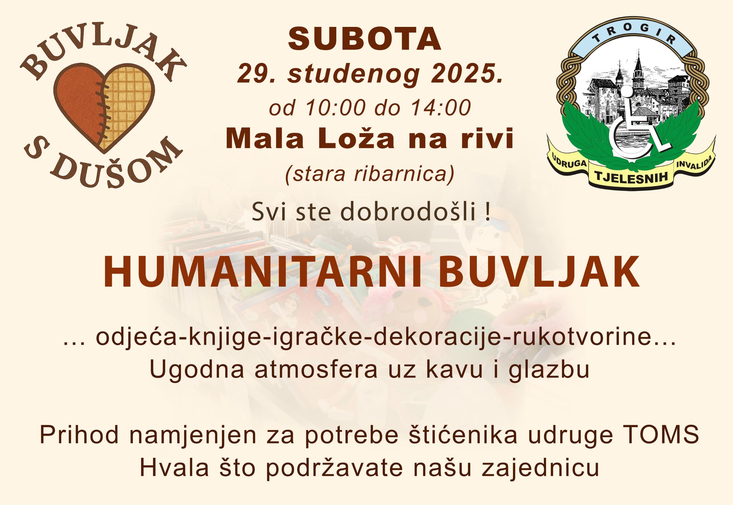 'Ponekad je dovoljno samo malo da učinimo nešto lijepo – za sebe, za druge, za našu zajednicu. Upravo zato vas pozivamo na Humanitarni buvljak s dušom, koji će se održati u subotu, 29. studenog, od 10 do 14 sati, u prostoru Male Lože na trogirskoj rivi (Stara ribarnica)', poručuju organizatori Humanitarnog buvljaka s dušom.